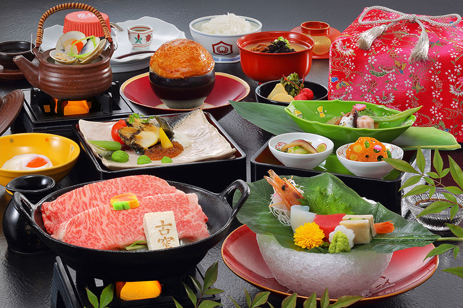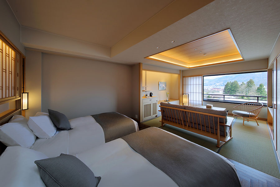 山形かみのやま温泉 「日本の宿 古窯」は蔵王連峰が一望できる緑豊かな高台に佇みます。蔵王連峰を一望できる展望露天風呂や、山形の素材にこだわったお食事、おもてなしの心で人気の高級旅館です。半露天風呂付き和洋室をご用意しました。