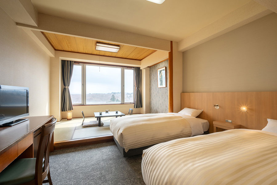 - お部屋は洋室と和洋室、1室2名利用。1泊目、田沢湖のホテルは洋室。2泊目、男鹿半島のホテルは和洋室となります。1名様でのご利用も同じタイプのお部屋になります。3名様以上での利用をご希望の場合はお問い合わせ下さい。