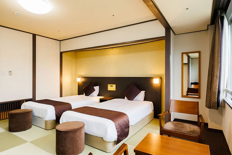 ホテルは1泊目、2泊目ともに天然温泉付き、ベッドのお部屋をご用意しました。