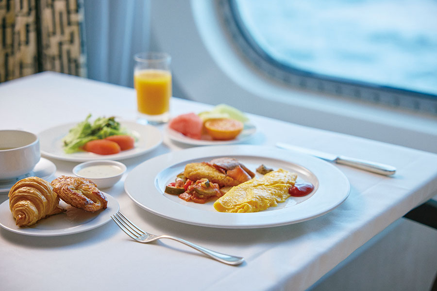 クルーズの楽しみの一つ、お食事も日本船らしい和食会席、テラスでのビュッフェ、飲み物や軽食も楽しめるカフェ、24時間いつでも利用可能なルームサービス。そし有料になりますが三國清三シェフ監修のスペシャルダイニング、寿司バーなど気分にあわせて選べます。「にっぽん丸」で35年以上築いてきた味を継承。洋上のダイニングを知り尽くしたシェフによるこだわりの食にご期待下さい。